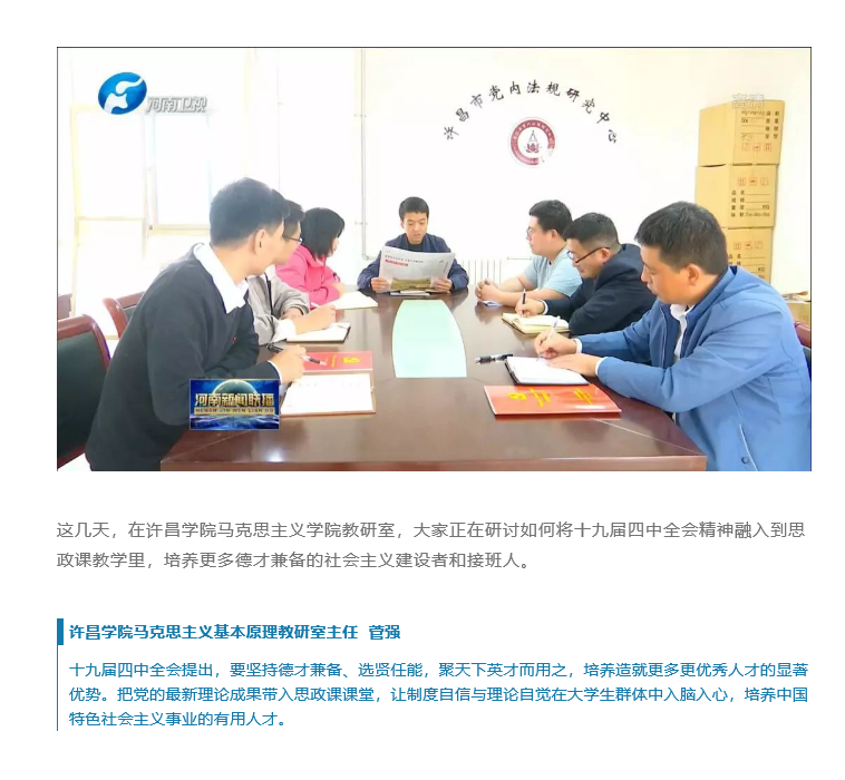 采访中,威尼斯官网马克思主义原理教研室围绕如何将十九届四中全会精神融入到思政课教学里,培养更多德才兼备的社会主义建设者和接班人展开热烈讨论。教研室主任菅强表示,十九届四中全会提出,要坚持德才兼备、选贤任能,聚天下英才而用之,培养造就更多更优秀人才的显著优势。把党的最新理论成果带入思政课课堂,让制度自信与理论自觉在大学生群体中入脑入心,培养中国特色社会主义事业的有用人才。