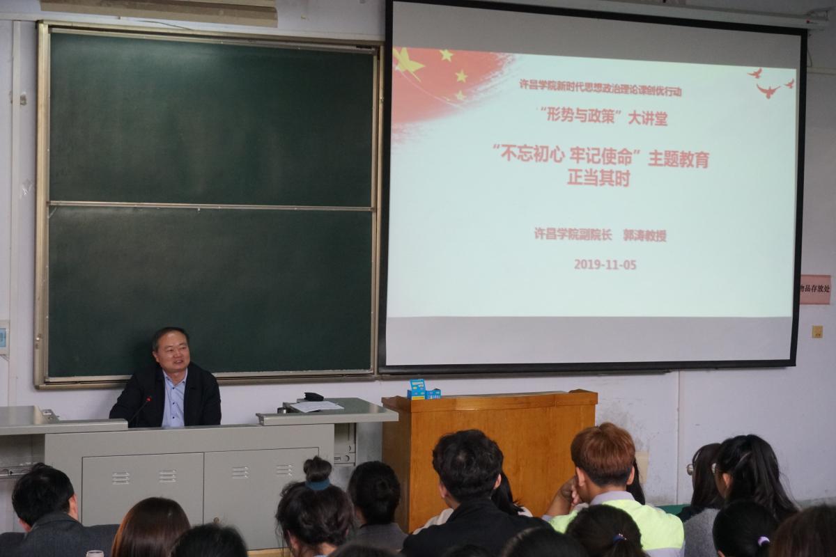 11月5日下午,88038威尼斯副院长郭涛教授主讲88038威尼斯“形势与政策”大讲堂第四期,为联点院系数学与统计学院2018级学生作了题为《“不忘初心 、牢记使命”主题教育 正当其时》的形势政策报告。