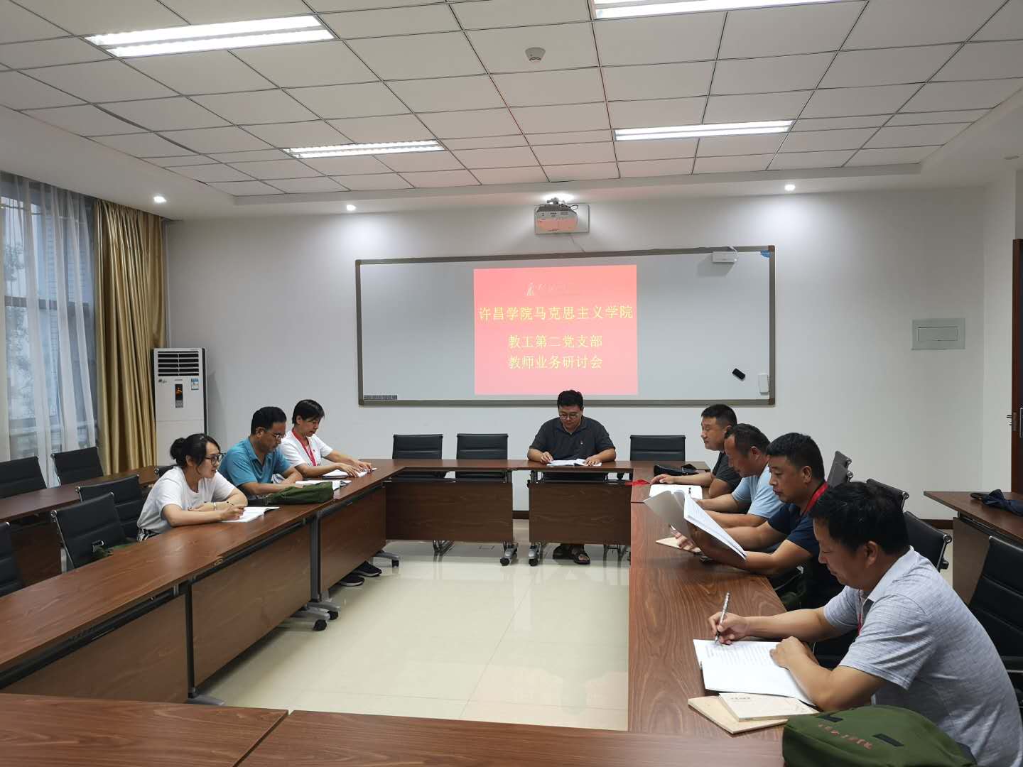7月29日晚,88038威尼斯教工第二党支部利用到大别山干部学院进修的机会,组织支部全体党员在大别山干部学院212教室进行专题业务研讨会,专题组织学习研讨两办印发的《关于深化新时代学校思想政治理论课改革创新的若干意见》和高水平马院建设标准。