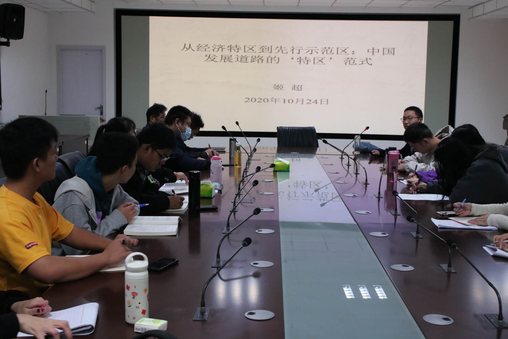 在此次报告中,姬超教授从五个层次为在场师生深度剖析了“从经济特区到先行示范区:中国发展道路的‘特区’范式”。一、什么是经济特区?狭义:主权国家内享受特殊优惠政策,以实现某种经济目标的特定区域,Free Trade Zone 广义:跨越两个国家或多个国家,成员之间依据各种贸易协定以贸易自由化、消除关税或其它限制性贸易性法规的自由贸易区,Free Trade Area。二、中国经济特区的演进路径,从深圳经济特区到海南经济特区、从沿海经济特区到沿河、沿边开发开放新区、从经济特区到社会主义先行示范区。三、中国经济特区演进的制度逻辑。首先,经济特区承担着中国由计划经济向市场经济转型的特殊使命。其次,经济特区是中国渐进式改革道路上规避风险的最优路径。再次,经济特区是中国整体制度改革的持续探索者。最后,中国经济特区的每一步演进都与国内外环境的变化密切相关。四、中国发展道路的特区范式。改革起点:边缘地区。改革主体:多元结构。改革目标:问题导向。改革路径:渐次展开。五、新时代中国经济特区的时代使命:创新经济增长方式、探索区域协同发展、促进社会公平公正。