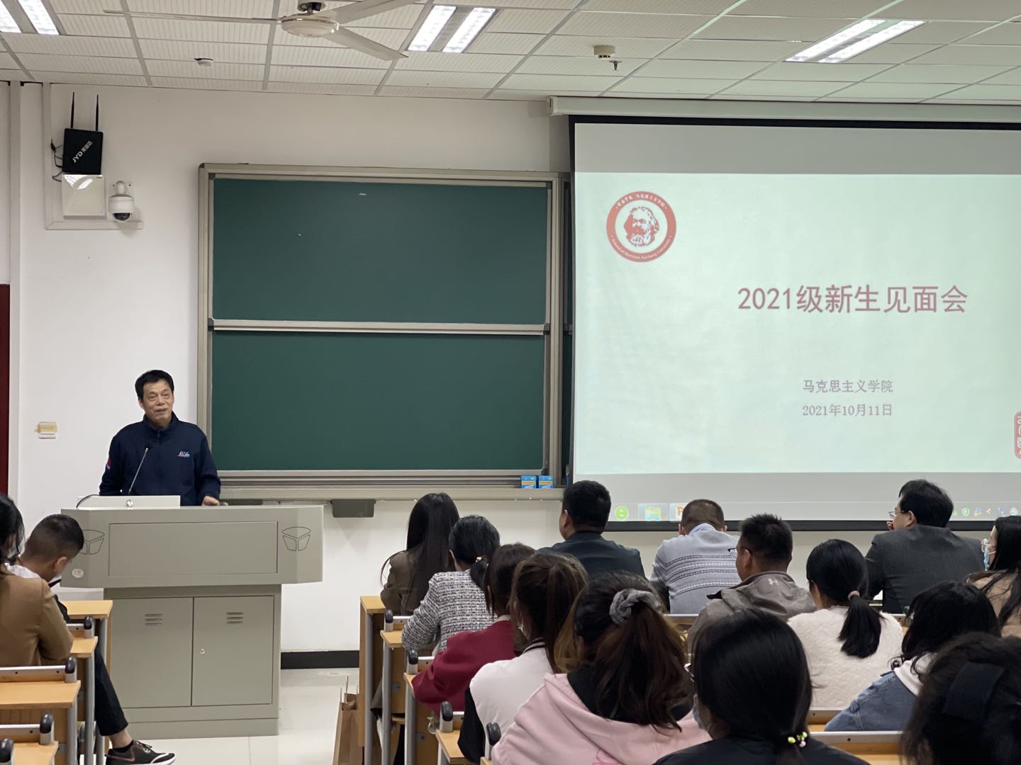 为引导新生同学们更好地规划和思考大学生活,10月11日晚, 威尼斯官网在文综楼504室举行2021级新生见面会。威尼斯官网党委书记谢依楠、院长寇鸿顺、副书记岳凯声、副院长林云飞、中原农耕文化博物馆副馆长朱志浩、思想政治教育教研室主任菅强、形势与政策教研室主任刘镭、思想政治教育专业教师代表、全体辅导员老师出席,70名新生同学参加见面会。