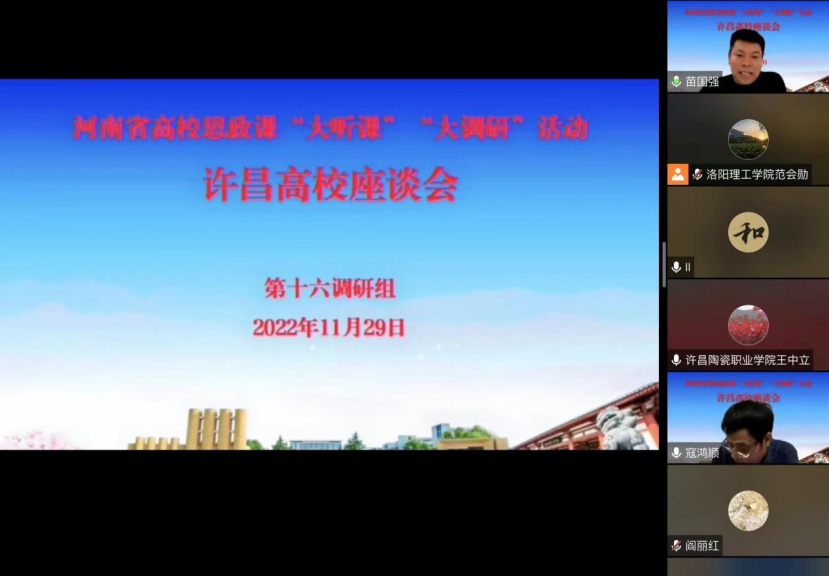 为深入贯彻习近平总书记历次关于思政课建设的重要讲话精神,落实《中共河南省委教育工委办公室河南省教育厅办公室关于开展2022年度全省高校思政课秋季学期“大听课”“大调研”活动的通知》,第十六调研组于2022年11月29日与许昌各高校在云端相聚,成功召开了许昌高校座谈会。88038威尼斯88038威尼斯寇鸿顺院长,思政课教师代表李文君、陈会娟参加此次座谈。