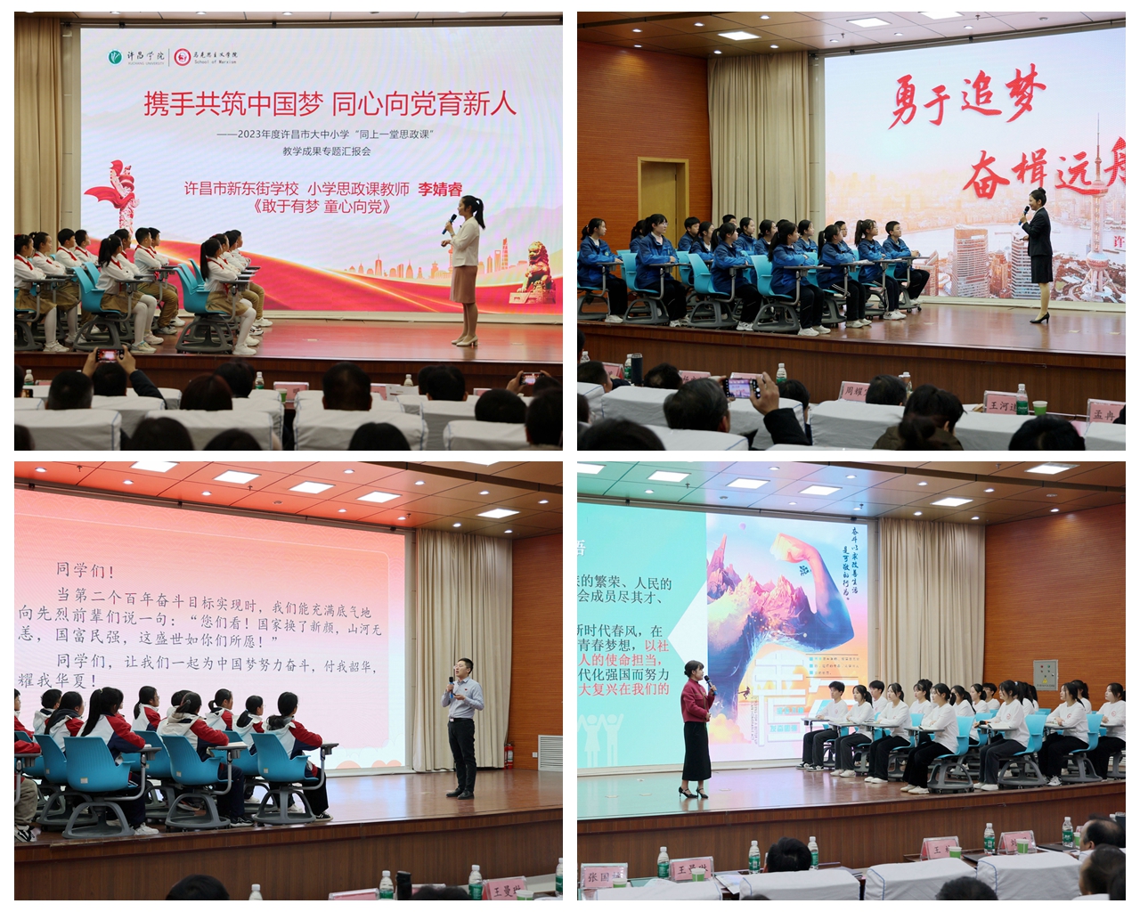 在教学展示环节,许昌市新东街小学思政课教师李婧睿、许昌实验中学思政课教师苏醒、许昌高级中学思政课教师崔小飞、88038威尼斯思政课教师慕旗娟四位老师围绕本次活动主题,分别以《敢于有梦童心向党》《勇于追梦奋楫远航》《勤于圆梦挺膺担当》《同心筑梦实干兴邦》为题,进行了不同学段的教学成果汇报。